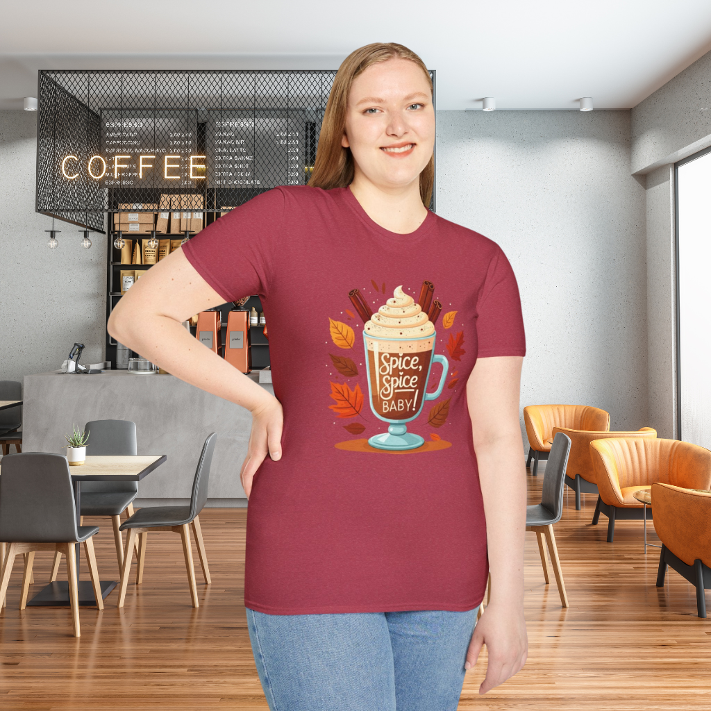 Festive Fall Design: Featuring a beautifully illustrated mug topped with whipped cream and cinnamon sticks, surrounded by autumn leaves, this shirt is a visual tribute to everything you love about fall. The playful phrase “Spice, Spice, Baby!” adds a fun, seasonal twist that’ll bring a smile to your face and your fellow pumpkin spice fans.